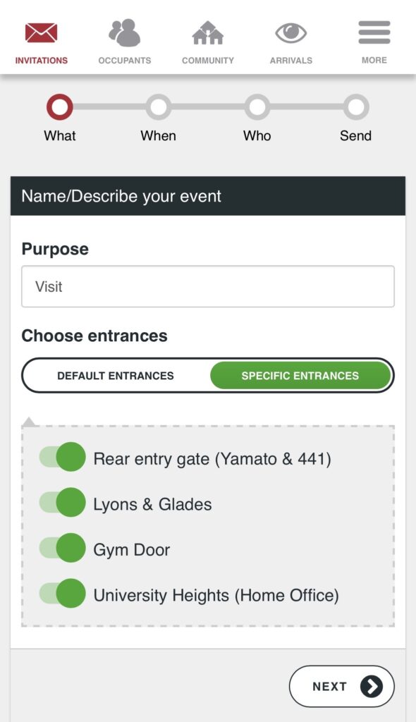 - Choose Entrances: For communities with multiple entrances access can be restricted to specific entrances.