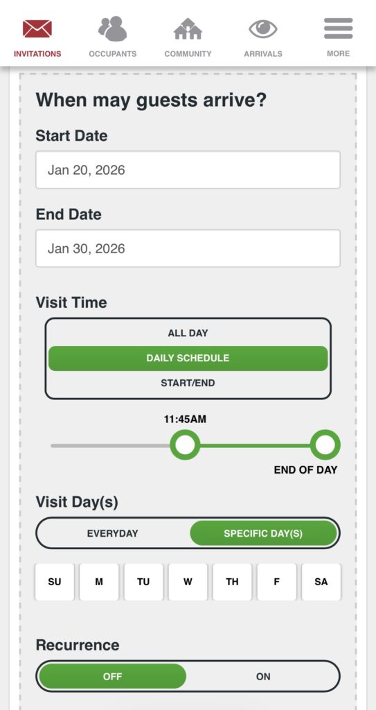 Recurring Schedules: Set regular access for repeat visitors or services.