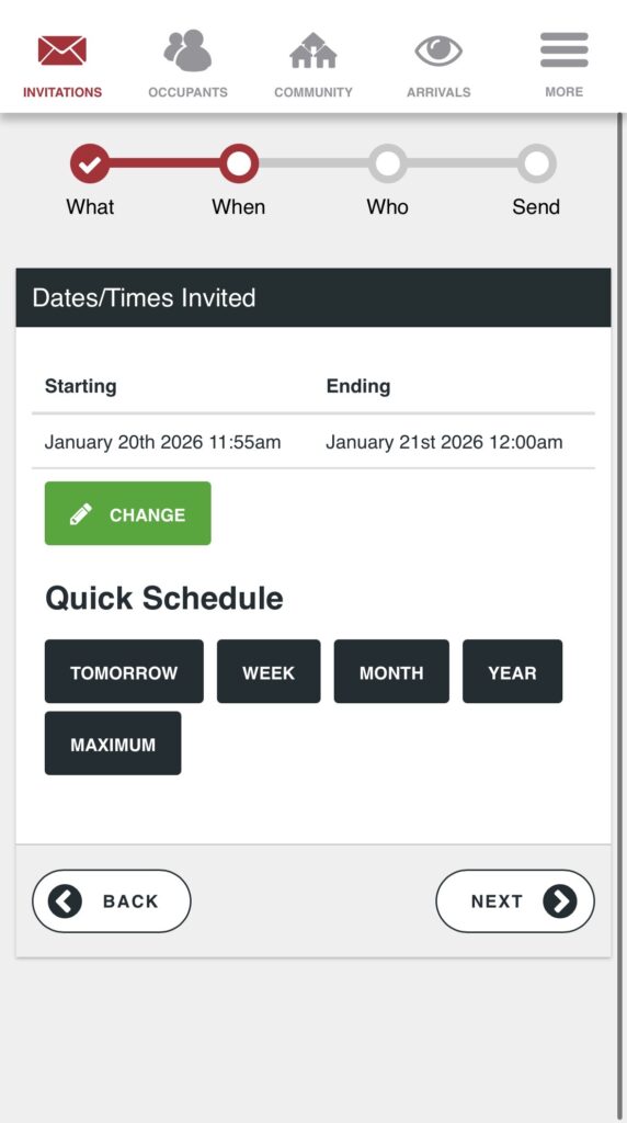Residents invite visitors and Tap2Open automatically generates a unique code for that visitor. The codes will follow all the rules of an invitation such as schedule, entrances, and use count.