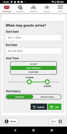 Your residents can invite guests from anywhere using their phone, tablet, or computer. Invitations go out instantly via text or email, and each one includes time restrictions so guests can only access the community when they’re supposed to. No more calling the guard station to leave instructions. No more hoping the message gets passed along correctly.